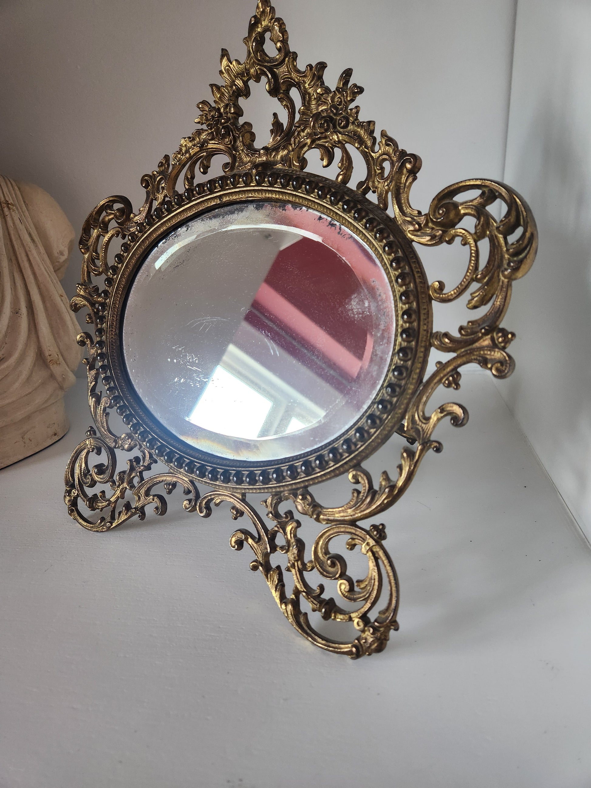 Measuring approximately 12" x 12", this mirror rests elegantly on a kickstand, standing 11.5" tall when reclined. A modified wire hook has been added for an optional hanging display, allowing for versatility in styling—whether as a romantic vanity accent, a luxurious wall detail, or an ornate centerpiece on a console or mantel.