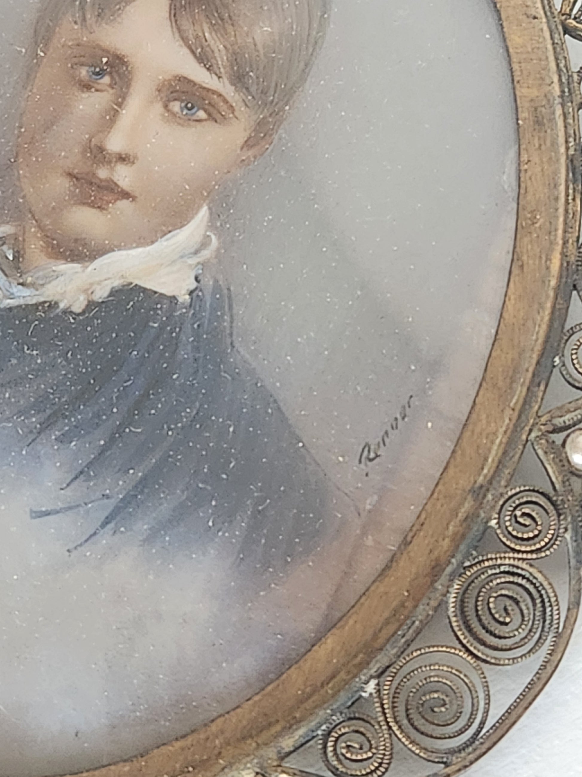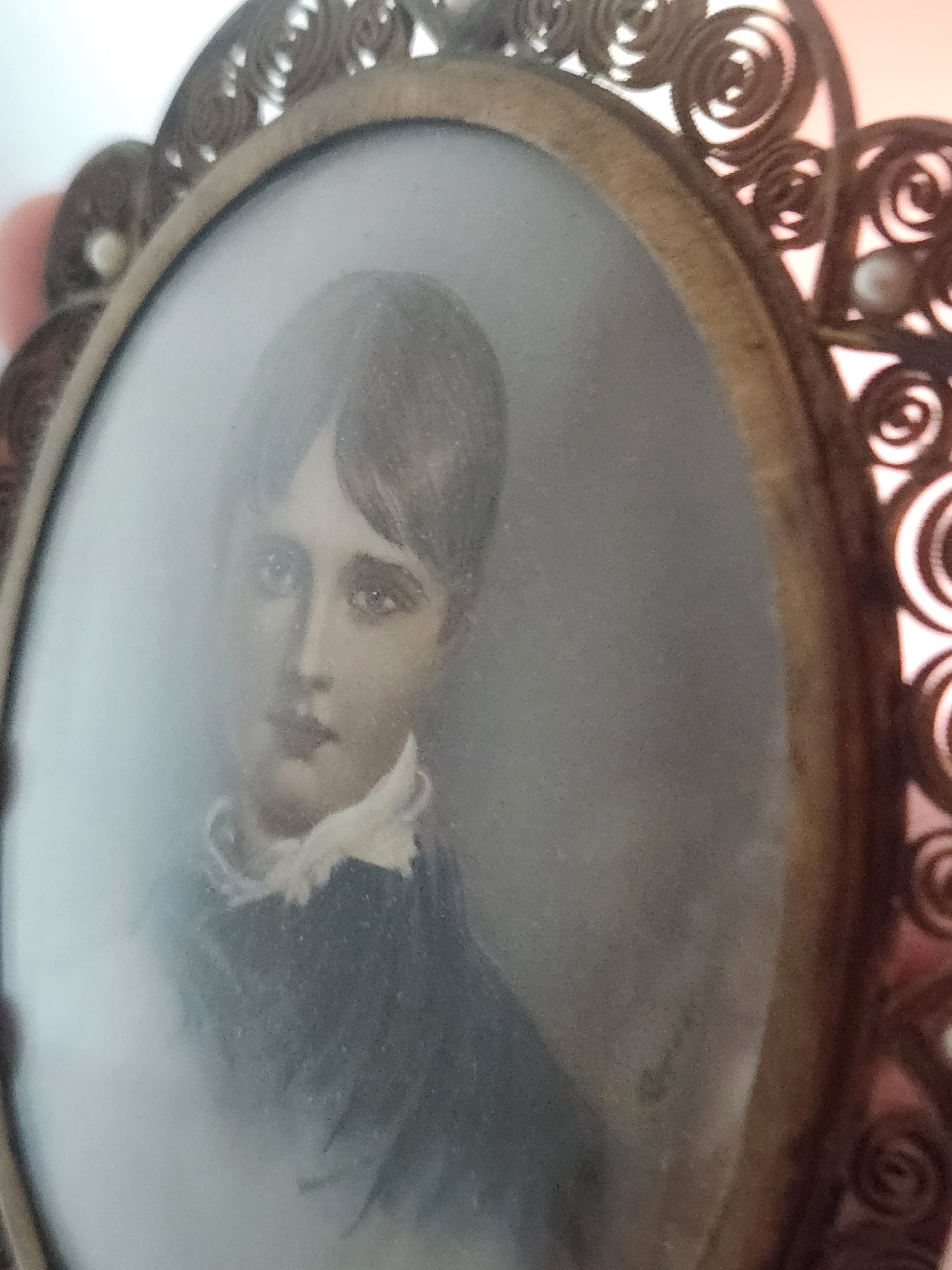 Antique Painted Portrait encased in Fillagree Frame with Pearl Embellishments