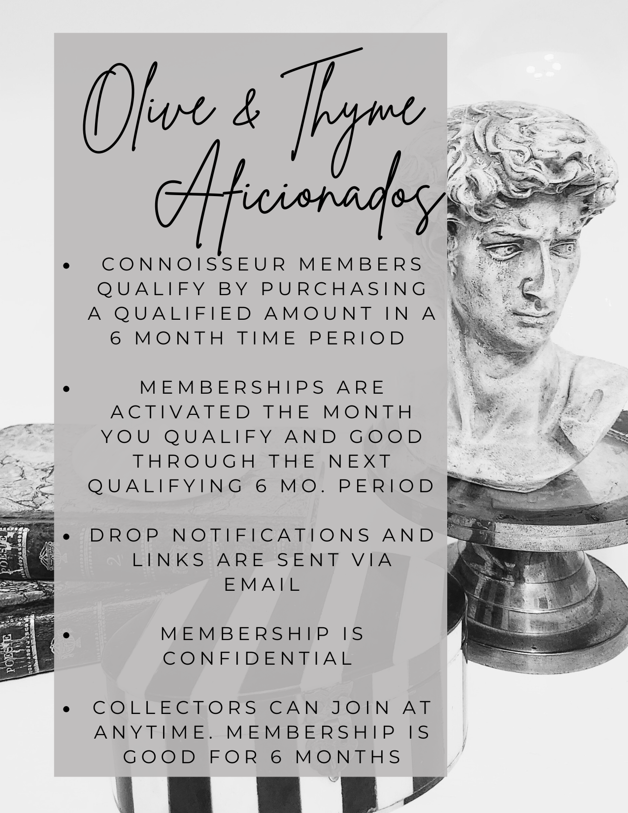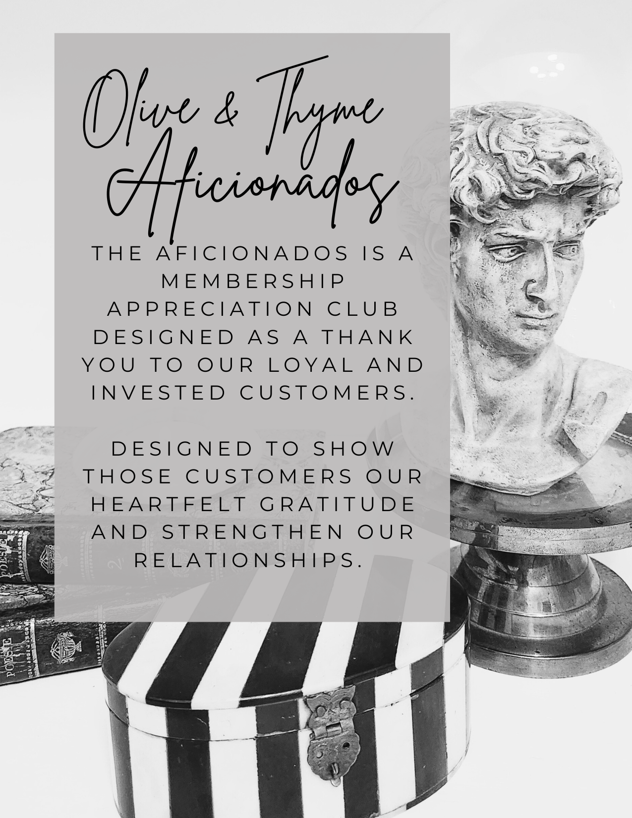 This tier is more than a membership—it’s an invitation to deepen your connection with Olive & Thyme, receive our gratitude in tangible ways, and ensure your collection grows with the rare and wonderful pieces you love.