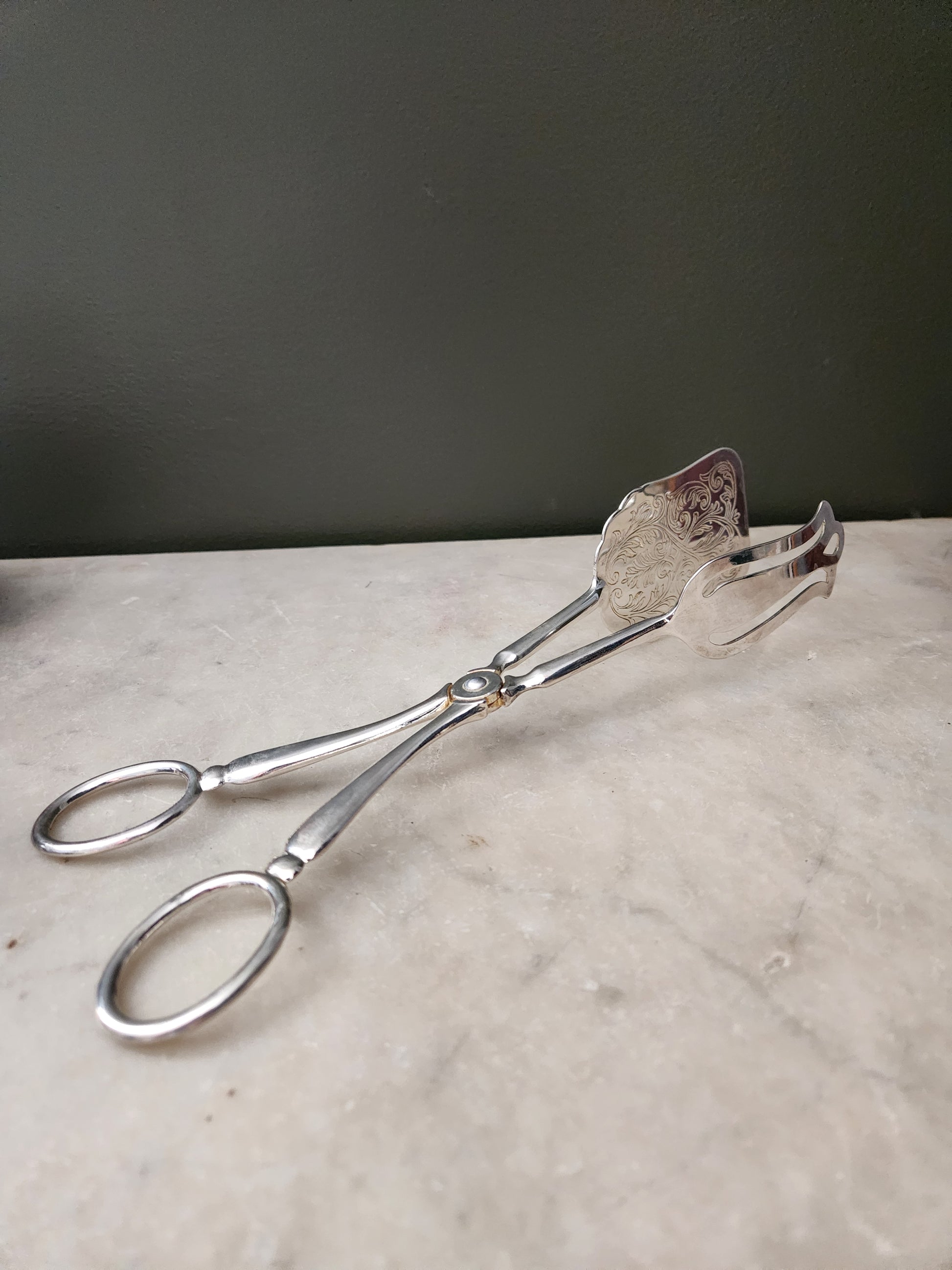 Engraved Silver-Plated Cake Tongs – Ornate Elegance for the Table